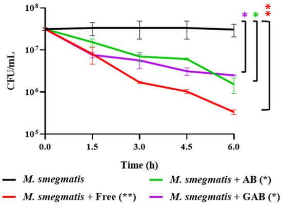 Reduction of mycobacterial populations in spiked simulated intestinal fluid (SIF) by free phages, alginate-bicarbonate (AB), and gastrically treated alginate-bicarbonate (GAB) beads. “Free” refers to a control consisting of free phages that were used during the encapsulation process. Significance is illustrated on the graphs by asterisks as follows: no asterisk = p ≥ 0.05; * = p ≤ 0.05; ** = p ≤ 0.01; The asterisk colour relates the significance value to the corresponding dataset.