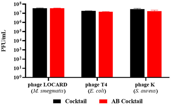 To examine the potential versatility of this approach, the encapsulation process was repeated with a three-phage cocktail (Cocktail) composed of phages with extremely distinct hosts. The phages LOCARD, T4, and K (targeting M. smegmatis, E. coli, and S. aureus, respectively) were co-encapsulated in the AB beads (AB Cocktail). There was no significant loss of particles for any of the phages during the encapsulation process (Figure 11), as similar titres of each phage were recovered from the beads compared to the titres present in the cocktail.