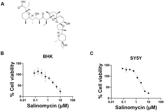 To further validate the identified hits, their antiviral effect on mCherry-SAD-B19 virus replication in BHK-21 cells was measured in an assay whereby whole-well fluorescence was quantified using a standard plate reader (Figure 2B) [26]. The effect of the molecules on cell viability was assessed in uninfected BHK-21 cells cultured in 96-well plates, using the MTS viability staining method as described previously [27]. A schematic comparison of the 96-well assay and the 384-well HTS assay, together with an analysis of the readout, is shown in Figure S1. The Z’ factor and coefficient of variation (CV %) of the different assays are comparable (Figure S1A,C). The signal-to-background ratio (S/B) is markedly better for the 384-well HCI assay but is still sufficiently high for the 96-well assay (Figure S1B). Ribavirin resulted in comparable antiviral activity in both (96 or 384-well) assays (Figure S1D). The confirmation assay was performed at concentrations ranging from 0.4 to 50 µM. Of the 4 primary hits, 2 have EC50 < 10 µM and CC50 > 10 µM. Only one molecule, salinomycin, was further investigated, as it had promising selective antiviral activity (selectivity index SI > 38) (Table S1).