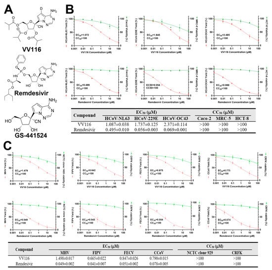 Antiviral activity of VV116 and Remdesivir against human and animal coronaviruses. (A) The chemical structures of VV116, Remdesivir, and GS-441524. GS-441524 is a well-studied broad-spectrum antiviral agent that inhibits RNA-dependent RNA polymerase (RdRp). Remdesivir is the phosphoramidate of the parent nucleoside GS-441524 and can be metabolized to GS-441524 triphosphate in the cell. VV116 is a deuremidevir isadeuterated, tris-isobutyric acid ester prodrug of GS-441524 with good oral bioavailability and is often referred to as a Remdesivir derivative. (B) The upper panel depicts a dose–response study on VV116 and Remdesivir against human coronaviruses (HCoV-NL63, HCoV-229E, and HCoV-OC43) in host cells (Caco-2, MRC-5, and HCT-8). In the lower panel, the half-maximal effective concentration (EC50) and the mean 50% cytotoxic concentration (CC50) of VV116 and Remdesivir are displayed. (C) The upper panel depicts a dose–response study on VV116 and Remdesivir against animal coronaviruses (MHV, FIPV, FECV, and CCoV) in host cells (NCTC clone 929 and CRFK). In the lower panel, the half-maximal effective concentration (EC50) and the mean 50% cytotoxic concentration (CC50) of VV116 and Remdesivir are displayed.