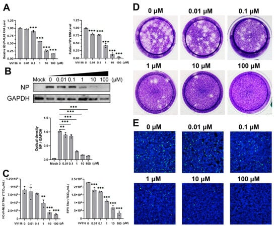 Among all the human and animal coronaviruses considered in this study, HCoV-NL63 and FIPV showed the most obvious inhibitory response to VV116. This inhibitory response was further confirmed in various ways. A series of dose-dependent experiments were performed, and different indicators of viral replication were detected. Intracellular viral RNA expression gradually decreased as the concentration of VV116 increased. When the concentration of VV116 was 0.1 μM, the viral RNA expression of HCoV-NL63 exhibited a statistically significant reduction compared with the control group. When the concentration of VV116 reached 1 μM, the viral RNA expression of the experimental group was half that of the control group. When the concentration of VV116 exceeded 10 μM, the viral RNA expression of the experimental group was less than a quarter of that of the control group (Figure 2A, left panel). FIPV was even more sensitive to the inhibitory effect of VV116. Its intracellular viral RNA expression dropped significantly upon the introduction of VV116 at a concentration of 0.01 μM. When the concentration of VV116 reached 1 μM, its viral RNA expression was half that of the control group. Finally, its viral RNA was barely detectable at a concentration above 100 μM (Figure 2A, right panel).
