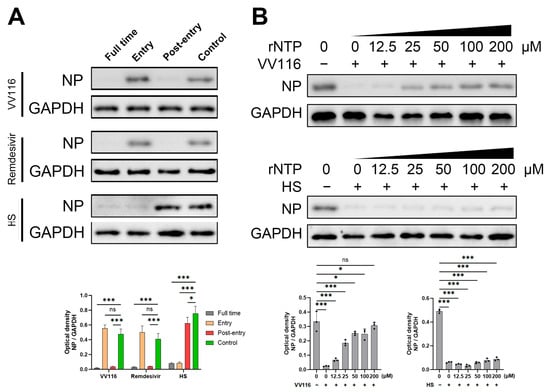 Cells were seeded in a 12-well plate and infected with HCoV-NL63 at an MOI of 0.1. VV116 (2 μM) or HS (300 μg/mL) was added with different concentrations of rNTP (Promega, Madison, WI, USA), as indicated in Figure 3B. Cells were harvested 24 h post-infection. Western blot was used to detect the expression of viral nucleoprotein, and GAPDH was used as an internal control.