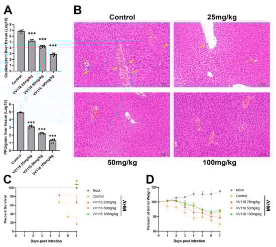 The mouse hepatitis virus (MHV) belongs to the coronavirus family and is a naturally occurring virus that infects mice. The MHV-infected mouse model is often used to evaluate the effect of anti-coronavirus drugs. Thus, we used this model to confirm the anti-coronavirus activity of VV116 in vivo. Three-week-old mice were intranasally infected with the virus and then treated with VV116 at different concentrations (25, 50, and 100 mg/kg, bis in die). Mice were sacrificed three days after infection, and liver tissues were collected and subjected to the measurement of viral genome copies and viral titers. As indicated in Figure 4A, both viral genome copies and titers decreased substantially with increasing VV116 concentration. In the experimental group in which the highest compound dose (100 mg/kg) was applied, both viral genome copies and titers decreased by four orders of magnitude. To further confirm the antiviral activity of VV116, histopathology was performed on the liver tissues of mice from each experimental group (Figure 4B). The livers of mice in the control group (mice infected with MHV but not treated with VV116) displayed a high number of focal infiltrations of perivascular inflammatory cells (yellow arrows) as well as a small number of hepatocytes with mild fatty degeneration. Some hepatocytes’ cytoplasms contained minute, spherical vacuoles. Following the administration of VV116, the infiltration of inflammatory cells was reduced. There were scattered inflammatory cell infiltrations around a small number of blood vessels in the livers of mice treated with 25 mg/kg VV116 but no obvious inflammatory cell infiltrations in the livers of mice treated with higher doses of VV116 (50 or 100 mg/kg).