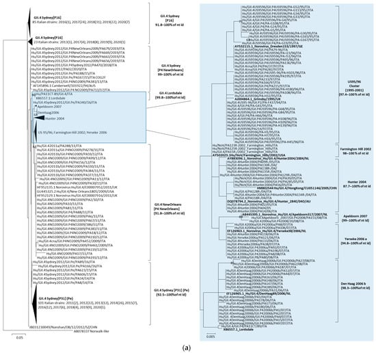 - Eden, J.S.; Bull, R.A.; Tu, E.; McIver, C.J.; Lyon, M.J.; Marshall, J.A.; Smith, D.W.; Musto, J.; Rawlinson, W.D.; White, P.A. Norovirus GII.4 Variant 2006b Caused Epidemics of Acute Gastroenteritis in Australia during 2007 and 2008. J. Clin. Virol. 2010, 49, 265–271. [Google Scholar] [CrossRef] [PubMed]