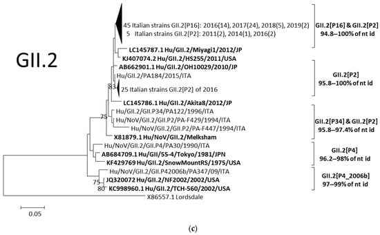- Bonura, F.; Urone, N.; Bonura, C.; Mangiaracina, L.; Filizzolo, C.; Sciortino, G.; Sanfilippo, G.L.; Martella, V.; Giammanco, G.M.; De Grazia, S. Recombinant GII.P16 Genotype Challenges RT-PCR-Based Typing in Region A of Norovirus Genome. J. Infect. 2021, 83, 69–75. [Google Scholar] [CrossRef] [PubMed]