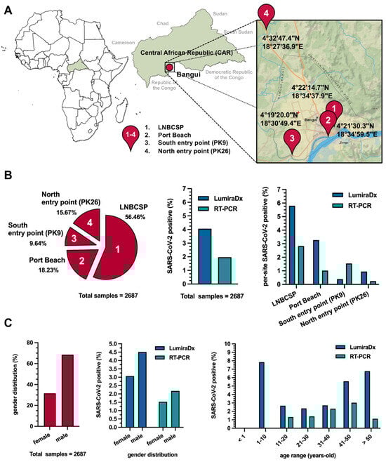 Geographic and demographic distribution of the samples. (A). Geographic distribution of the four different sampling checkpoints in Bangui, Central African Republic (CAR). (B). Sample distribution at the checkpoints (left); diverse percentage of subjects positive to Severe Acute Respiratory Syndrome Coronavirus 2 (SARS-CoV-2) depending on the test performed (middle) and depending on the collection point (right). (C). Demographic characteristics of the positive subjects compared to the totality of the participants: general gender distribution (left) and gender (middle) and age range (right) distribution according to the tests performed.