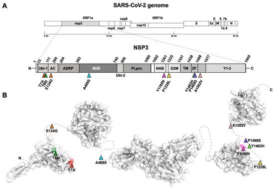 Non-structural proteins 3 (NSP3) schematic and tridimensional structure with reported mutations. (A). NSP3 structure scheme showing domain boundaries and non-synonymous mutations (coloured triangles). (B). NSP3 3D structure with the solved domains connected by dashed lines representing unsolved regions of the protein where most of the mutations found are indicated.