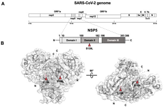 The SARS-CoV-2 30kb genome encodes sixteen non-structural proteins (nsps) and four structural proteins (N, nucleocapsid, E, envelope, M, membrane, and S, spike). We decided to focus our analysis on the proteins validated as therapeutic targets, as NSP3 (multifunctional protein, including papain-like protease function), NSP5 (main protease), NSP8 (polymerase cofactor), NSP12 (RNA dependent RNA polymerase), and N and S protein. As an NSP12 cofactor, NSP7 was also included in the study, but mutations were absent in the respective aminoacidic sequence. We found nine mutations in the NSP3 sequence [34] (Figure 3A,B), specifically T73I and T86I in the ubiquitin-like domain 1 (Ubl-1), E134G in the Glu-rich acidic region (AC domain), A488S in the SARS-unique domain (SUD), Y1185N in the nucleic-acid-binding domain (NAB domain), P1228L in the Betacoronavirus-specific marker domain (G2M domain), and, finally, Y1463H, P1469S, and A1502V in the NSP3 ectodomain (3Ecto), also called zinc-finger domain (ZF domain). Among them, only A488S, P1228L, and P1469S mutations were reported as non-defining mutations for the Delta variant [35]. We located the single mutation S139L in the II 3C protease-like domain on NSP5 [36,37] (Figure 4A,B), present in only one of our samples (Supplementary Figure S2).