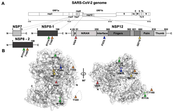 We identified three mutations on NSP12 [38] (Figure 5A,B): V42A in the β-hairpin region, P323L on the interface domain, and G671S on the fingers’ subdomain. In addition, two mutations were found at the C-terminal domain of its cofactor NSP8: R111A and T145I. Particularly, P323L and G671S mutations presented a high frequency among the genomes we studied, as a confirmation of the presence of these mutations in the Delta variant [35], while V42A and the NSP8 mutations presented a very low frequency among our dataset (Supplementary Figure S3).