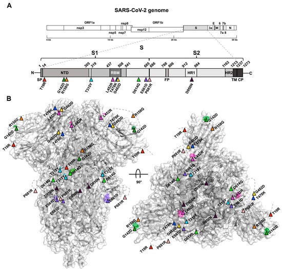 Spike protein (S) schematic and tridimensional structure with reported mutations. (A) S structure scheme showing domain boundaries and non-synonymous mutations as coloured triangles. (B) S 3D structure in its biological assembly as a trimer shown from two different perspectives with the coloured mutations on each monomer.