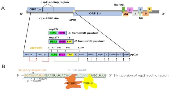 Map of the PRRSV genome. (A) The PRRSV genome is composed of ORF1a, ORF1b, ORF2a, ORF2b, ORF3–7 and ORF5a and produces at least 16 nonstructural and 8 structural proteins. NSP2 is cleaved from ORF1 translation products to form mature proteins and it is composed of HV-I, PLP2, HV-2, TM and C-terminal domains. (B) NSP2 undergoes a −1/2 ribosomal frameshift and generates NSP2N and NSP2TF variants in response to both pcbp2 and NSP1β.