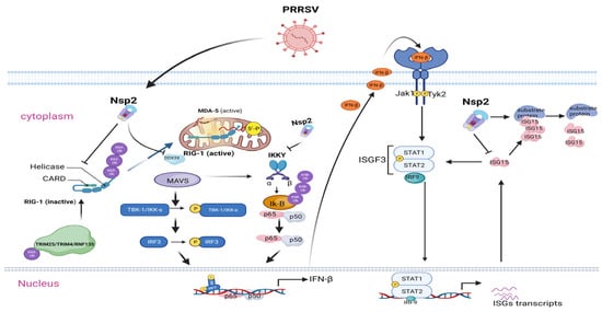 Natural immunity is important as the first line of host defense against viral infection. The intracellular RLR receptor RIG-I/MDA5 is an important molecule for the recognition of RNA viruses (Figure 2). RIG-I senses and binds to viral 5′ppp-RNA through the C-terminal CTD structural domain, undergoes a conformational change and releases the CARD structural domain, which in turn activates RIG-I via catalytic polyubiquitination of the K63 linkage of the CARD and CTD by ubiquitin ligases such as TRIM25, TRIM4 and Riplet (RNF135). RIG-I is activated by catalyzing the polyubiquitination of the K63 linkage of CARD and CTD. The zinc finger protein ZCCHC3 can act as a coreceptor for RLR to facilitate the binding of RIG-I and MDA5 to viral RNA and can promote polyubiquitination and activation of the K63 linkage of the CARD structural domains of RIG-I and MDA5 by TRIM25 []. The PRRSV NSP2 protein inhibits the ubiquitination activation of RIG-I (DDX58) by means of TRIM25 through plp2 deubiquitination activity, and ZCCHC3 knockdown also promotes PRRSV replication [].