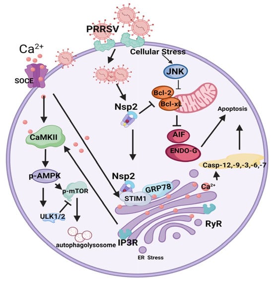 Autophagy as an important physiological process in eukaryotic cells is negatively regulated through the PI3K-AKT-mTOR and MAPK-ERK-mTOR inactivation of ULK1 [,,]. Therefore, autophagy is negatively regulated, or positively regulated through AMPK-ULK1. The researchers found that PRRSV infection induced autophagy in the following ways: PRRSV infection activates the opening of endoplasmic reticulum IP3R channels, allows Ca2+ into the cytoplasm, causes Ca2+ imbalance in the ER, induces endoplasmic reticulum stress, increases endoplasmic reticulum stress marker protein GRP78, activates the MAPK and PI3K signaling pathways, and promotes autophagy formation. On the other hand, endoplasmic reticulum calcium ion levels were reduced by the endoplasmic reticulum Ca2+ receptor STIM1, which accumulates and translocates to the vicinity of the plasma membrane []. The accumulated STIM1 protein then activates Orai1, prompting the opening of the CRAC calcium channel pore, extracellular calcium inward flow to the endoplasmic reticulum, endoplasmic reticulum Ca2+ influx into the cytoplasm via IP3R again and cytoplasmic Ca2+ level increases []. Calcium is a ubiquitous intracellular messenger involved in a variety of signaling processes, such as gene transcription, differentiation, proliferation and kinase activation []. Ca2+ and Ca2+ receptor proteins play important roles in the regulation of autophagy, and excessive release of Ca2+ from the endoplasmic reticulum activates the calmodulin-dependent protein kinase ii (CaMKII) and adenosine monophosphate-activated protein kinase (AMPK) signaling cascades and increases the lipidation of LC3II, leading to the inhibition of mTOR signaling and the induction of autophagy [,]. In addition, the ER is an important organelle for Ca2+ storage and protein processing and is highly sensitive to viral infection [,]. When endoplasmic reticulum function is disrupted, misfolded and unfolded, proteins accumulate in the lumen of the endoplasmic reticulum, interfering with Ca2+ homeostasis and leading to endoplasmic reticulum stress, which in turn induces autophagy []. PRRSV infection induces endoplasmic reticulum stress and disrupts Ca2+ homeostasis by means of a mechanism that ultimately activates autophagy through the CaMKII-AMPK-mTOR pathway in order to promote autophagy for self-replication []. CaMKII (a multifunctional Ca2+-dependent kinase) is activated in response to elevated Ca2+ levels, which in turn phosphorylates the downstream effector AMPK and enhances the lipidation of LC3II to promote autophagy. This process can be inhibited by 4-PBA, which suppresses PRRSV replication by inhibiting endoplasmic reticulum activation, and by ML-9 HCL, which suppresses viral replication by inhibiting SOCE channels []. The authors found that NSP2 interacts with STIM1 and GRP78 to induce autophagy by overexpressing Marc145 cells through a single gene []. The effect of NSP2 on the STIM1 and GRP78 proteins has not yet been demonstrated. Meanwhile, PRRSV-induced endoplasmic reticulum stress opens the SOCE channel to allow extracellular Ca2+ to enter the intracellular space. The SOCE channel is the main calcium channel on the plasma membrane of the cell, which mediates Ca2+ entry from the extracellular medium. Orai1 on the plasma membrane and STIM1 on the endoplasmic reticulum are the proteins responsible for SOCE channel activation [].