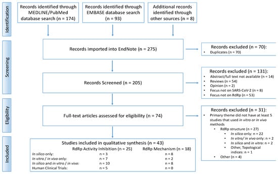 Studies that focused on RdRp activity inhibition and RdRp mechanisms included evidence obtained through multiple experimental methods. Twenty-five articles explored the primary theme of RdRp activity inhibition through in silico simulations (n = 3), in vitro or in vivo experiments (n = 7), a combination of these methods (n = 10), or through human clinical trials (n = 5). Eighteen articles investigated the primary theme of RdRp mechanism through in silico simulations (n = 8), in vitro or in vivo experiments (n = 2), or a combination of these methods (n = 8). Thus, 43 articles met all the eligibility criteria and were included in the present scoping review synthesis.