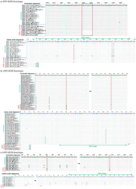 Nucleotide and amino acid alignments of (a) SPPV B22, (b) LSDV, and (c) GTPV homologue genes and their proteins. For SPPV, the nucleotide alignment shows a 14-nucleotide deletion in some of the vaccines but not in the field strains. For LSDV and GTPV, the nucleotide alignments showed an insertion (A) in some of the vaccines but not in the field strains. The mutations resulted in frameshifts and early protein truncations. * SPPV Morocco vaccine—sequenced in-house.
