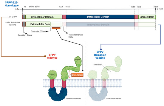 Protein domain predictions of SPPV B22 wildtype and vaccine. Vaccine-related changes would result in a truncated and absent protein. The red square bracket indicates the DIVA target region.