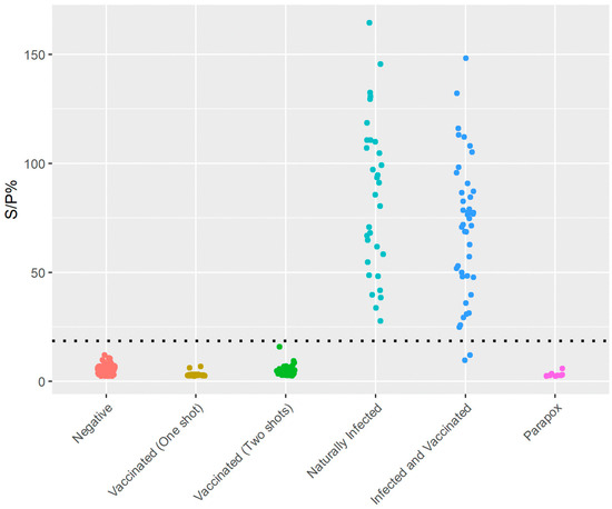 The SPP/GTP wts-DIVA iELISA was tested on well-characterized SPP-vaccinated (n = 14), SPP and GTP naturally infected (n = 27), and negative (n = 87) serum samples as well as on 12 parapox samples for specificity (Figure 4).