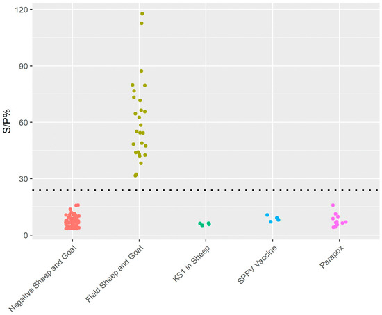 Sample distribution of the SPP/GTP wts-DIVA iELISA. Sheep- or goat-positive (34), SPPV Romanian and LSDV KSGP 0240 (KS-1) sheep-vaccinated sera (8), sheep- and goat-negative (87), and parapox-positive (12) serum samples were tested, using conditions for SPP/GTP wts-DIVA iELISA. None of the vaccinated or non-specific samples were detected.