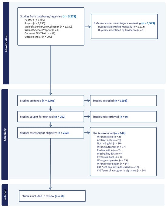 The review team collaborated with a research librarian (LC) to develop and execute a comprehensive search of the literature. This search used controlled vocabulary and keywords related to K17 expression in human cancers. Supplemental Data S1 lists full electronic search strategies. A search was designed in PubMed and translated into the following databases: Embase via Scopus (Elsevier Science, Amsterdam, The Netherlands), Cochrane Central Register of Controlled Trials (CENTRAL) via Cochrane Library (Wiley, New York, USA), Web of Science Core Collection (Clarivate), and Web of Science Preprint Citation Index (Clarivate, Philadelphia, USA). All searches were conducted from database inception to 5 July 2023. Animal studies were removed by applying an exclusion filter in PubMed and Scopus. No language, age, or other restrictions were applied to the search results. A Google Scholar search was executed on 5 July 2023, and the first 200 results, sorted by relevance, were exported. The results were downloaded into EndNote (Clarivate) and underwent manual deduplication by the research librarian. Unique records were uploaded to Covidence (Veritas Health Information, Melbourne, Australia) for screening and review by the study team using pre-determined inclusion/exclusion criteria.