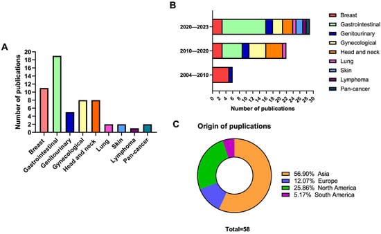 The characteristics of included studies: (A) number of publications per cancer type; (B) number of publications relative to year of publication; (C) origin of publications.