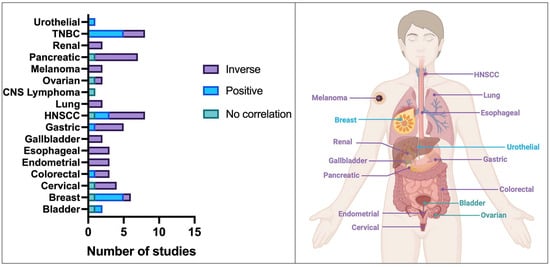 Two pan-cancer analyses have found a negative correlation in renal, hepatocellular, lung and pancreatic adenocarcinoma, melanoma, mesothelioma, and endometrial and bladder urothelial carcinoma (not included in Table 2) [,]. Another pan-cancer analysis found a positive correlation between breast, thyroid renal, and endometrial cancer [].