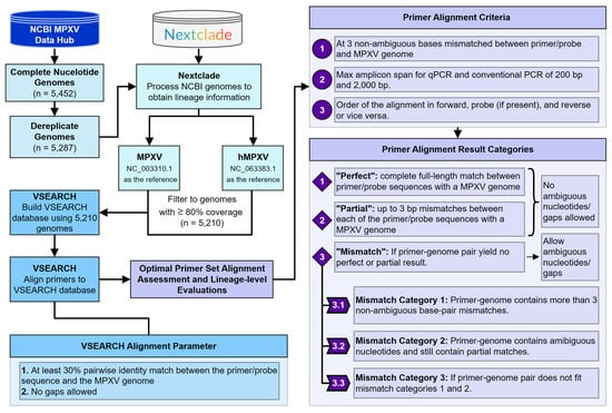 Detailed workflow describing the MPXV genome collection, lineage analysis, and MPXV primer evaluation. The MPXV genomes were downloaded from the NCBI viral genome resource, dereplicated, and analyzed using Nextclade software to determine the lineage and coverage information. A total of 80% coverage-filtered genomes were then used to build a database to which the MPXV primers were aligned and evaluated. The VSEARCH criteria and primer alignment criteria were used to select acceptable primer-genome pairs. The alignment results were then divided into “perfect”, “partial”, and “mismatch” categories based on the alignment quality. The “mismatch” category was further divided into three categories based on the VSEARCH results.