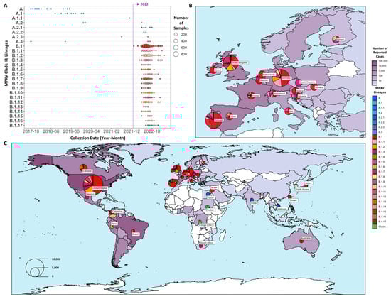 Summary of MPXV genome lineages, collection dates, and geolocations. (A) Collection date (aggregated by month) for all 26 Clade IIb sublineages. The purple vertical line indicates the beginning of 2022. European (B) and global (C) illustrations of lineage distributions across different regions, including all samples with an available sample collection time between 2022 and 2023. The regions with reported cases are shown in a purple gradient (white = low, dark purple = high) based on the cumulative number of Mpox cases as of June 2023 reported by the WHO. Each region with collected genomes also has colored pie charts representing the distribution of the MPXV lineages identified.