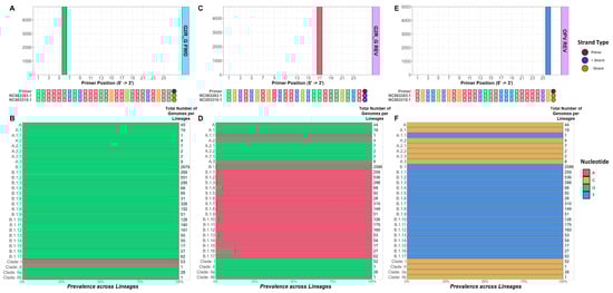 Single nucleotide mismatch patterns for the selected primers with respect to the RefSeq MPXV Clade I (NC_003310.1) and Clade II (NC_063383.1) reference genomes with more detailed clade/lineage-specific mismatches to the 5210 NCBI MPXV genomes analyzed. The G2R_G forward primer, G2R_G reverse primer, and OPV reverse primer are highlighted in panels (A,B), (C,D), and (E,F), respectively. Panels (A,C,E) detail the primer alignments to the reference genomes with the number of mismatched NCBI MPXV genomes shown at each primer position above, colored according to the nucleotide polymorphism. Panels (B,D,F) depict the fraction of genomes for each clade/lineage that harbors the mismatches highlighted in (A,C,E). In all panels, the nucleotides are colored as follows: A = red, C = yellow, G = green, T = blue. The strands of the Clade reference genome aligned sequences are indicated to the right of the sequence as follows: positive (+) strand = blue, negative (-) strand = yellow.