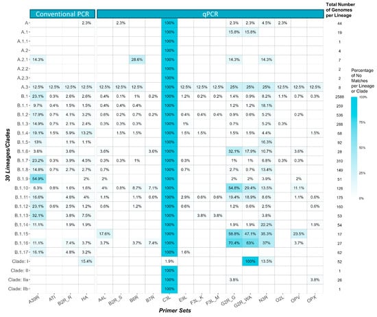 Percentage of mismatches per lineage for each of the primer sets. The total number of genomes per lineage is displayed on the right. All blank cells represent the primer alignments in either the perfect or partial match category (i.e., 0% mismatches).