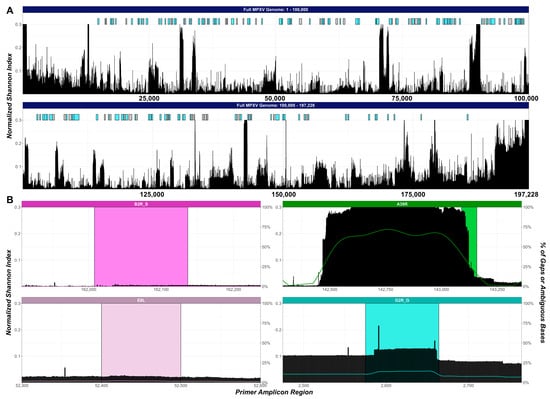 Among these conserved regions identified, two overlapped with primers evaluated in this study (B2R_S and E9L, Figure 5B). The design for B2R_S was based on a hypothetical protein record from the Vaccinia virus (YP_233066.1), which resulted in a single nucleotide mismatch at the 18th position on the probe sequence across almost all 5210 genomes. If the correct nucleotide were used, one would obtain a highly conserved primer across almost all lineages. The E9L primer region also coincided with a conserved region, with a small increase in the normalized Shannon index due to the slight presence (~1–2%) of ambiguous nucleotides in this region (Figure 5B). On the other hand, the A39R forward primer overlapped with a poorly conserved region (>0.2 normalized Shannon index covering the forward primer binding sites), explaining why many of the alignments were in the mismatch categories (Table 2, Figure 5B). Similarly, G2R_G was found within a relatively poor conserved region (normalized Shannon index ~0.1) with two noticeable increases in the Shannon index corresponding to the two commonly mismatched nucleotides in the forward and reverse primers (Figure 3 and Figure 5B). Together, these results reveal multiple poorly conserved regions that were independently sequenced, which indicates that certain MXPV regions cannot be effectively surveilled in silico as novel MXPV lineages emerge and should, therefore be avoided in PCR designs.
