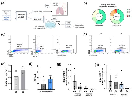 In the adult human cohort study “AZCRA” (Investigation of the role of cytokines, chemokines, and their receptors in the inflammatory process in asthma patients), we recruited healthy, non-asthmatic and non-atopic, controls and asthmatic adults. Both groups attended a baseline visit, B0, during which clinical data and nasal swabs were collected (Figure 1a). Comparing the number of airway infections in the last 12 months in both groups, we found no significant difference between the two groups. However, several asthmatic participants had up to six (6) airway infections in the last 12 months, compared to the maximum of two (2) respiratory infections in the control group (Figure 1b). Comparing the lung function measurements between the two groups, we found, by trend, worse results in the asthma group. Next, we wanted to analyze the antiviral immune response of the airway epithelium to RV and thus collected nasal swabs. We infected the cells freshly after collection with RV or used them as control without infection (CN) and cultured them for 3 days. On day 0 and 3, we performed FACS staining on some of our samples from control patients to ensure that the cultured cells were nasal epithelial cells (NECs). We checked the expression of the epithelial cell marker EpCAM on the cells, which stands for epithelial cell adhesion molecule, which is expressed only on the epithelium. This marker belongs to the type I transmembrane glycoproteins. It is involved in the regulation of cell adhesion, proliferation, migration, and stemness. Here, we found that there was a proliferation of EpCAM-expressing cells between day 0 and day 3 (Figure 1c–e). After 72 h, we first assessed the viral load by RV-A1b qPCR in all our infected conditions and found higher levels in NECs derived from asthmatic patients (Figure 1f). Then, we measured the IFN-β and IFN-λ mRNA in the uninfected and RV-infected condition and found higher levels by trend in the control group and lower levels in the RV-infected NEC culture derived from subjects with asthma (Figure 1g,h), indicating a defect in interferon response in nasal epithelial cells derived from asthmatic subjects and especially upon RV-A1b infection in combination with higher RV-A1b load in the cells.