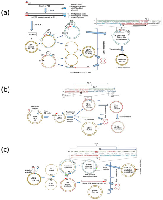 The successful genetic manipulation (insertion, deletion, and mutation) of the CGMMV genome-based plasmid constructs (pBP4 and pBP4-∆CP) hinged on the careful design of primers. Typically, long primers with a high GC content (approximately 50–60%) and an annealing temperature ranging between 65–72 °C were crucial. For the targeted insertion of genes (NbPDS gene and CPToLCNDV gene) at specific positions within the CGMMV genome, long PCR primers were crafted by incorporating sequences from the target genes and the plasmid backbone where the insert was to be integrated (refer to Table 1). In general, forward (P1-F/P1a-F) and reverse (P2-R/P2b-R) primers, each around 35–40 nucleotides long, contained 20-nucleotide sequences from the target gene (NbPDS or CPToLCNDV) and 15–20 nucleotide-long overhanging ends that were complementary to the sequences on the insertion target sites of the plasmid backbone. The products amplified in the first-round PCR (228 nucleotide sequences of the NbPDS gene) were then used as mega-primers (P3/P3c) for the second-round PCR. Notably, an additional reverse primer (P4/P4d) with a complementary sequence partly to the insert and the target plasmid was designed for the self-circularization of the amplicons (refer to Figure 1a–c). The primer set, P1-F, P2-R, and P4, was employed for inserting the NbPDS gene into the pBP4 plasmid (infectious clone of CGMMV). Similarly, another primer set, P1a-F, P2b-R, and P4c, was used for inserting the CPToLCNDV gene into the pBP4-∆CP, the CP-deficient pBP4, through LC-PCR.