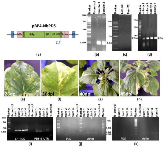 The efficacy of the CGMMV-based VIGS vector (pBP4-NbPDS) (refer to Figure 2a) was assessed through a planta gene silencing assay. The native PDS gene in N. benthamiana was targeted to visualize the silencing phenotype, characterized by chlorophyll photobleaching on the leaves. A partial fragment of the NbPDS gene, derived from the mRNA sequence, was inserted in the sense orientation into the CGMMV genome through the LC-PCR to create a VIGS vector. Following agro-infiltration of the VIGS vector, all six N. benthamiana plants began exhibiting the photobleaching phenotype from 16 dpi to 45 dpi (see Figure 2e–h). This outcome demonstrated the successful development of a CGMMV genome-based VIGS vector. The effectiveness of the VIGS vector was confirmed through RT-PCR, which was conducted to amplify the CP fused with NbPDS from the mRNA of the photobleached leaves. RT-PCR utilized CP forward primer (BM 556F) and PDS reverse primer (BM910R), as well as PDS forward primer (BM909F) and 3′ UTR reverse primer (BM 489R). The results exhibited the expected amplification of a 700 bp long CP fused with PDS and a 550 bp long PDS fused with UTR regions (see Figure 2i).