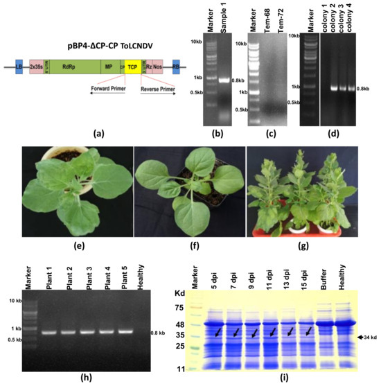 N. benthamiana plants agro-infiltrated with the pBP4 construct (infectious clone) displayed symptoms of green mottle mosaic (Figure 3e). However, plants agro-infiltrated with pBP4-∆CP, containing a partial CP gene of CGMMV, and pBP4-∆CP-CPToLCNDV construct, containing the full-length sequence of the CPToLCNDV gene, did not exhibit any symptoms (Figure 3f,g). RT-PCR analysis with CPToLCNDV gene-specific primers revealed the amplification of the expected 770 bp band in the leaves of all N. benthamiana plants agroinfiltrated with the pBP4-∆CP-CPToLCNDV construct (Figure 3h). However, such amplification could not be obtained in plants agroinfiltrated with pBP4 and pBP4-∆CP. These results confirm the expression of mRNA transcripts of the CP gene of ToLCNDV from the pBP4-∆CP-CPToLCNDV constructs in the infiltrated leaves of N. benthamiana. Additionally, the expression of a 34.0 kDa protein from this transcript was detected at 5–15 dpi in SDS-PAGE electrophoresis (Figure 3i).