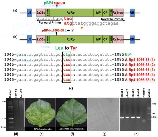 The tri-nucleotide change from CTG to TAC resulted in a single amino acid substitution from leucine (L) to tyrosine (Y) in the helicase domain of CGMMV. N. benthamiana plants agro-infiltrated with the pBP4-Δ1066-68 construct did not exhibit symptoms of CGMMV. In contrast, all plants agroinfiltrated with the pBP4 construct displayed the typical green mottle mosaic symptoms of CGMMV (Figure 5e). Interestingly, electron microscopy revealed the presence of many rod-shaped virions (300 × 18 nm) in plants infiltrated with the mutated construct (pBP4-Δ1066-68) (Figure 5g). A comparison with pBP4-infiltrated plants showed a similar number of virions in plants infected with the mutated construct. Furthermore, RT-PCR using CGMMV CP gene-specific primers (BM 556F and BM 557R) showed the amplification of a 480 bp CP gene fragment in both the inoculated and systemic leaves of N. benthamiana plants infiltrated with the mutated construct (Figure 5h). The mutation resulted in latent infection. These results demonstrate that the LC-PCR is highly efficient in creating mutations for studying functional genomics in CGMMV.