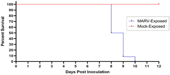 Kaplan–Meier Plot of Survival of MARV-Exposed and Mock-Exposed Cynomolgus Macaques. The survival of MARV-exposed (blue) and Mock-exposed (red) cynomolgus macaques is plotted on a Kaplan–Meier plot. All (n = 12) MARV-exposed animals succumbed between Days 8 and 10 PI. All (n = 6) mock-exposed animals survived until the end of the study.