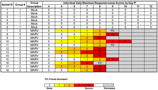Daily maximum responsiveness scores are summarized in Figure 2; the time from virus exposure to a responsiveness score of four in MARV-exposed animals is shown in Table 3. All mock-exposed NHPs appeared healthy and normal throughout the study and received responsiveness scores of zero at all timepoints (Figure 2).