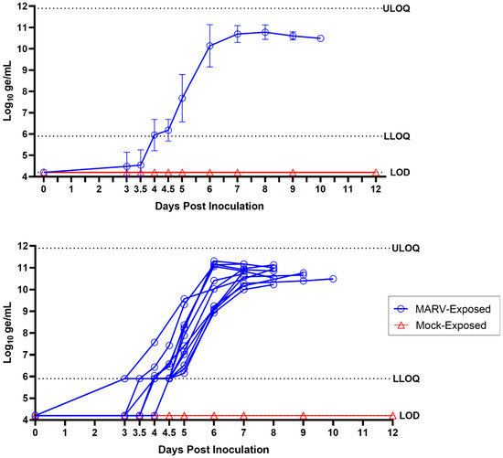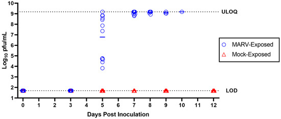 Serum Infectious Virus. MARV plaque assays were performed on serum samples collected from mock-exposed and MARV-exposed animals at intervals throughout the study. LOD = 1.70 log10 pfu/mL; ULOQ = 9.18 log10 pfu/mL. Horizontal bars represent group means.