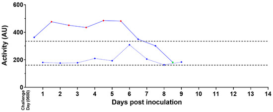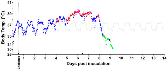 Temperature and activity signals were collected and analyzed as described previously using a sampling rate of 1 sample per second [47]. Baseline data were collected for 5 days prior to challenge (Days −6 through −2).