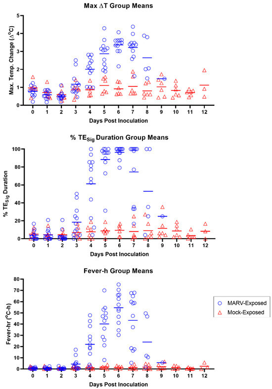 Body Temperature Measured by Telemetry. Results of the individual MARV-exposed (blue open circles) and mock-exposed (red open triangles) animals for the maximum daily temperature elevation value (∆TMax; top panel), daily percentage of significant temperature elevation values (TESig; middle panel), and daily fever-hours (fever-h; bottom panel). Days post-inoculation = calendar days. Horizontal bars in all panels represent group means.