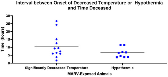 Interval between Onset of Decreased Temperature or Hypothermia and Time Deceased in MARV-Exposed Animals. Horizontal bars represent means. Significantly decreased temperature: temperature greater than 3 standard deviations below mean values calculated from the baseline period for longer than 2 h. Hypothermia: greater than 2.0 °C below baseline for longer than 2 h.