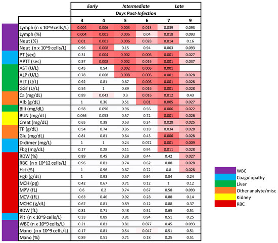 Blood samples were collected in ethylenediamine tetraacetic acid (EDTA) tubes. Hematology analysis was conducted, within 4 h of sample collection, using an Abaxis Vetscan HM5 Hematology Analyzer (Abaxis; Union City, CA, USA). The following hematologic parameters were analyzed: neutrophils, lymphocytes, monocytes, white blood cell count, red blood cell count (RBC), hemoglobin, hematocrit, mean corpuscular volume, mean corpuscular hemoglobin, mean corpuscular hemoglobin concentration, RBC distribution width—standard deviation, RBC distribution width—coefficient of variation, platelet count, and mean platelet volume.
