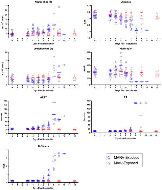 The clinicopathologic changes in the bloodwork for MARV-exposed animals are consistent with the effects of systemic inflammation, catecholamine-mediated changes, consumptive coagulopathy, and hypovolemic shock, all of which can be attributed to infection with MARV. Ultimately, the systemic inflammation, coagulopathy, and direct cytopathic effects of MARV all contributed to multiorgan dysfunction, organ failure, and death in all 12 of the MARV-exposed animals (Figure 9). Statistically significant changes in clinical pathology parameters described here are differences between mock- and MARV-exposed groups in change from baseline values (p ≤ 0.05).