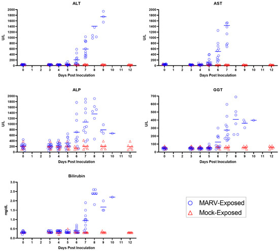 Alterations in hepatic parameters were among the later changes to occur in this MARV model. However, two hepatic-related parameters, AST and ALP, demonstrated significant elevations by Day 5 PI (p = 0.002 and 0.008, respectively; Table 4 and Figure 16). By Day 6, PI, increases in AST and ALP were observed in all animals (10 of 10 animals tested) and were significantly elevated (p = 0.006 for both parameters). Increases in AST and ALP over baseline on Day 5 and Day 6 PI are thus potentially useful parameters either as triggers or in support of this timeframe as a treatment window. More definitive markers of hepatocellular damage were apparent by Day 6 PI with significant increases in ALT and GGT.