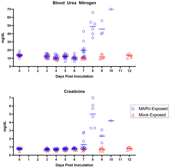 Mock-exposed animals were euthanized after anesthesia on Days 12 and 13 PI. No MARV-exposed animals survived to the end of the in-life phase. Scheduled necropsies were performed within 12 h of euthanasia. Terminal blood collection was taken by CVC or venipuncture. The final physical exam occurred prior to administration of the euthanasia solution.