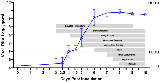 Plaque assay was conducted as previously described to assess the challenge material and the burden of infectious virus in serum collected at multiple time points (Table 1) [48]. The LLOQ for the plaque assay is 3.00 log10 pfu/mL (1000 pfu/mL), equivalent to 10 pfu detected in two of two wells at the least dilute serum sample. The LOD for this plaque assay, starting with a 1:10 dilution of the serum and plating 100 µL per well in two wells (six-well dish format), is 1.70 log10 pfu/mL (50 pfu/mL), equivalent to 1 pfu detected in one of two wells. The ULOQ for the assay is 9.18 log10 pfu/mL. For infectious virus plaque serum viremia, values “>LOD, <LLOQ” were imputed as 1000 pfu/mL or 3.00 log10 pfu/mL, values “<LOD” were imputed as 50 pfu/mL or 1.70 log10 pfu/mL, and values > ULOQ were imputed as 9.18 log10 pfu/mL.