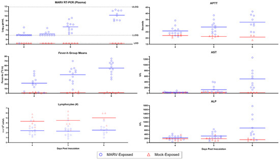On Day 6 PI, all MARV-exposed animals (12 of 12) met the criteria for fever, and hyperpyrexia occurred in 7 of 12 animals. Additionally, more distinction was seen in TMax, TESig duration, and fever-h in all MARV-exposed animals compared to mock-exposed animals (Figure 6).