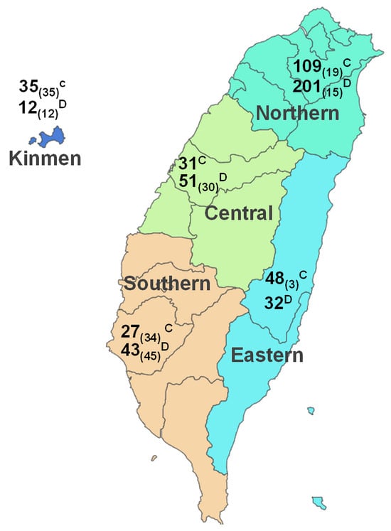 The major regions and number of animals enrolled in the study of SFTSV viral RNA detection. In total, 735 serum samples were collected from animals in Taiwan. The labels with superscript letters C or D denote the count of cat or dog samples derived from veterinary clinics, while the number of samples from stray animals is indicated within the subscript brackets.