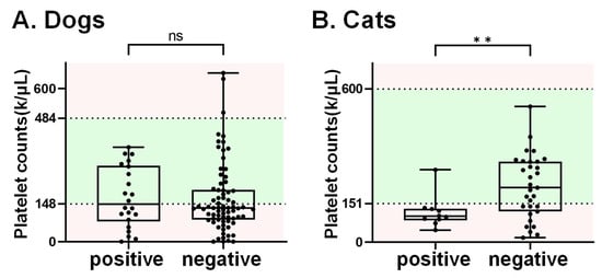 The platelet counts in dogs and cats. The 137 serum samples with records of platelet counts included 96 canine and 41 feline samples. The normal range for platelet counts is highlighted in green. Notably, the average platelet counts in cats that tested positive for SFTSV RNA (referred to as the “positive group”) were found to be significantly lower than those in cats that tested negative for SFTSV RNA. Note. ns indicates no significance, ** refers p-value < x0.01.