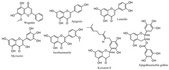 To recapitulate, flavonoids such as wogonin, apigenin, luteolin, myricetin, isorhamnetin, and kuwanon E exert notable anti-HSV-2 effects by targeting multiple stages of the viral life cycle and different cellular pathways. Additionally, EGCG stands out for its striking inhibition of HSV-2 replication. These findings emphasize the diverse and promising potential of flavonoids as effective anti-HSV-2 agents, acting through multifaceted mechanisms that involve interference with viral processes and modulation of cellular pathways. Table 2 outlines the anti-HSV-2 mechanisms of flavonoids, while Figure 2 highlights their respective chemical structures.